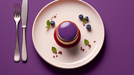 Top view of a blueberry cheesecake served on a pink plate with fork and knife on purple background