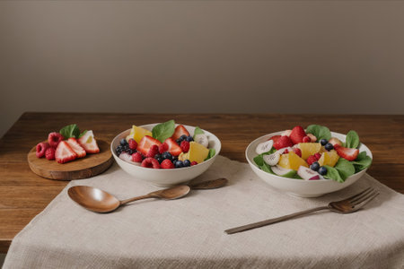 A vibrant fruit salad is artfully arranged with watermelon slices, blueberries, cherry tomatoes, and fresh herbs on a rustic wooden table, showing bright colors and textures.