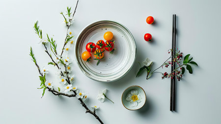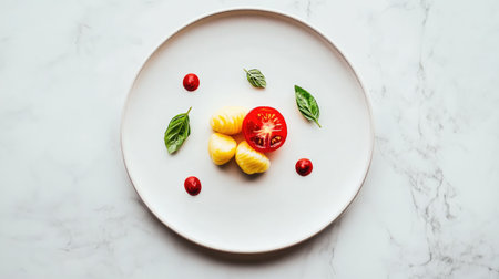A beautifully arranged plate showcasing fresh ingredients featuring ripe tomato, basil leaves, and delicate garnishes, ideal for culinary presentations.