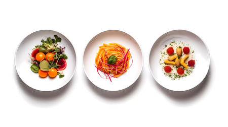 A vibrant vegetable medley elegantly arranged on a white plate, showcasing fresh ingredients in a gourmet presentation perfect for culinary enthusiasts.