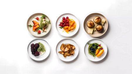 Top view of a set of healthy food on a white background.