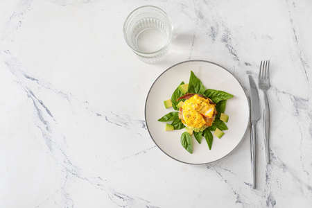 Trendy breakfast set. Flat-lay of poached Eggs Benedict on sourdough bread toast with green salad and pork ham and cup of coffee on cafe table, top view, wide composition