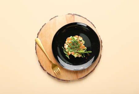 Delicious salmon tartar on color background