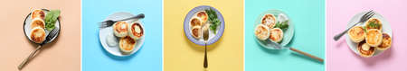 Set of plates with tasty cottage cheese pancakes on colorful background, top view