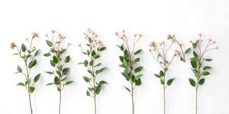 A collection of five floral branches with green leaves and small flowers arranged in a row on a white background, ideal for use in botanical designs, floral patterns, and nature-themed projects.