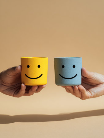 Two hands grasp brightly colored cups with smiling faces, symbolizing friendly dialogue in a serene and inviting atmosphere.