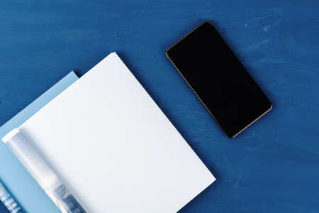 Top view of open magazine page with copy space on classic blue background