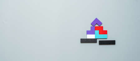 Home shape block with colorful wood puzzle pieces on gray background.
