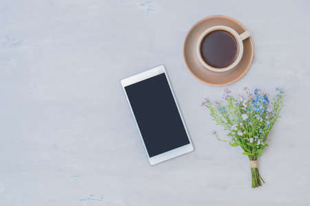Flat lay composition with a tablet, a cup of coffee and small blue flowers on a light background