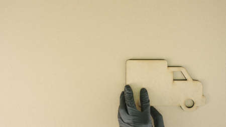 Placing blank truck icon made of recycled cardboard on the table. Sustainable transportation concept