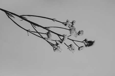 Branches of dried flowers and buds close-up. Abstract still life of flowers. Flat lay, top view. Copy space for text.