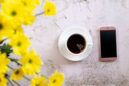 A cup of black coffee with smartphone and yellow flowers.