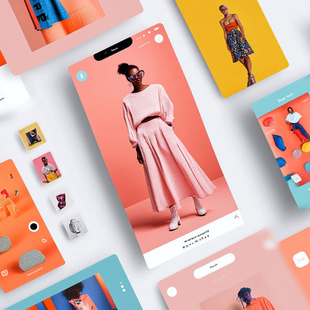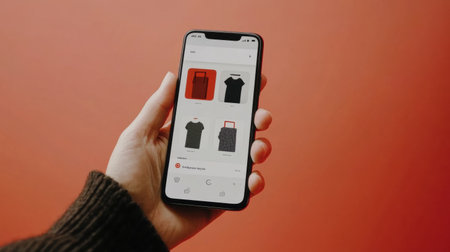 Hand interacts with a smartphone browsing while an online store app. Sleek user interface displays various clothing items against a vibrant background.