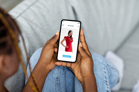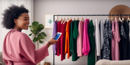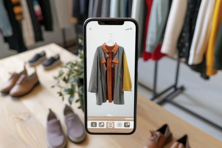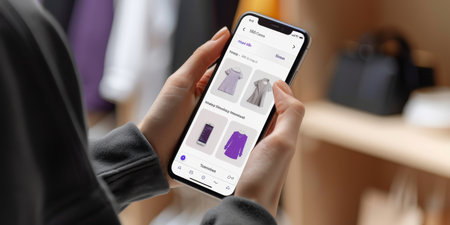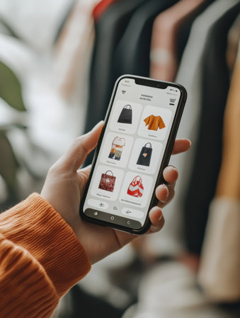 User engaging with a smartphone app to browse clothing options, featuring a modern interface that enhances the shopping experience indoors.