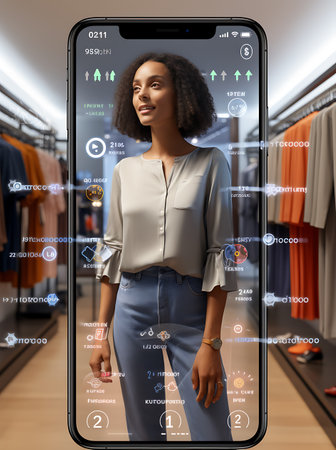 Smartphone screen displaying an augmented reality view of a young woman trying on clothes in a fashion boutique.