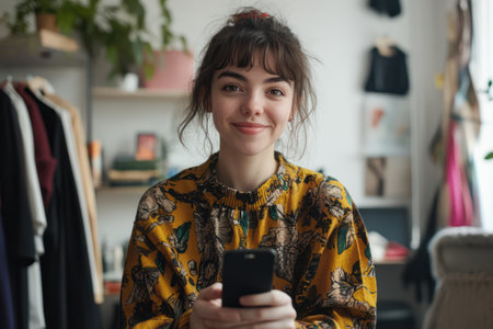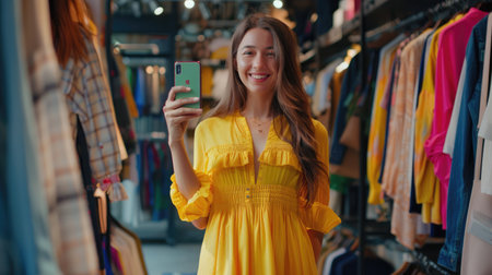 beauty female fashion vlogger presenting yellow dress to cellphone and smiling showing clothes selling online live streaming