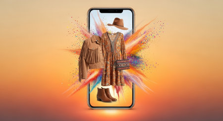 Trendy clothing ensemble showcased on mobile device, including dress, jacket, hat, and boots, with vibrant splashes in the background, illustrating online shopping experience
