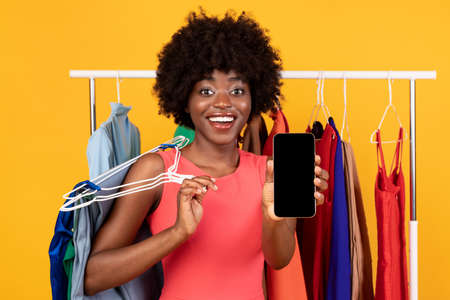 African Female Showing Smartphone Screen Near Clothing Rack, Yellow Background