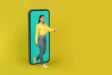 Woman Walking Out Of Phone Stretching Hand For Handshake, Studio