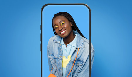 Young black woman shopping online at phone, look at new clothes at screen at home, enjoy mobile app