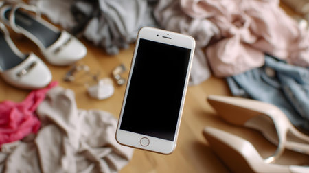 Smartphone with blank screen on the background of women's clothing.ai generated