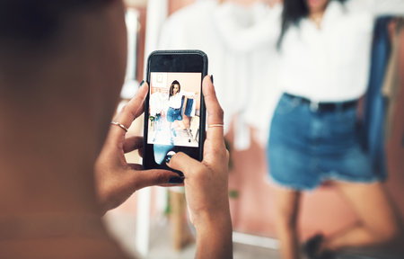 Hand, women and phone screen of fashion photography, profile picture and social media update. Back, mobile and people for content creation, designer collection and clothes blog of style tips at house