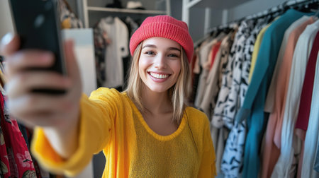 A fashion influencer taking selfies with new designer clothing, sharing their latest haul on social media.