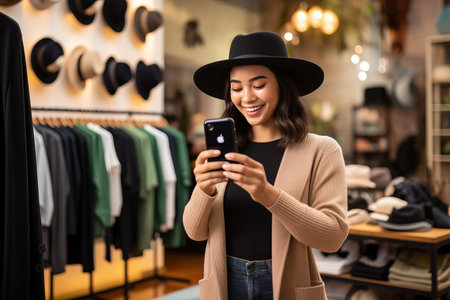 A shopper explores fashion items on their mobile device in a trendy retail environment.