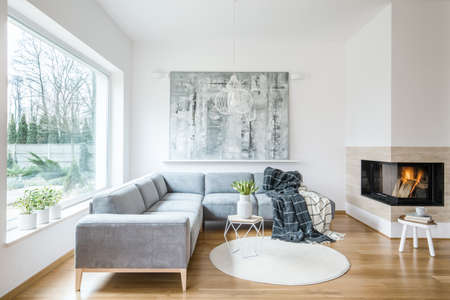 White sitting room interior with grey corner sofa, tulips in vase placed on an end table, fireplace and modern art painting