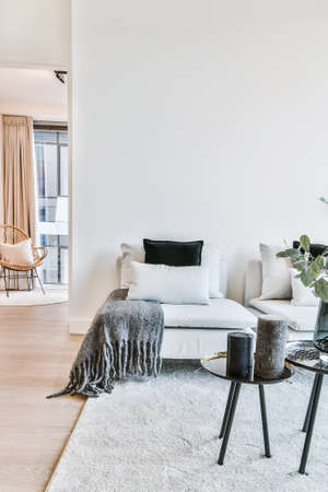 Comfortable soft sofa and chair with cushions and plaid placed near wall in modern living room with carpet and decorative items on small tables styled in white and gray colors
