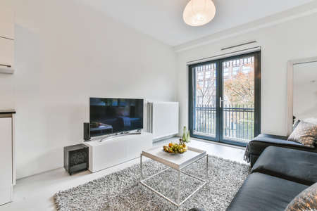 Interior of light living room with stylish furniture and decorations and glass door and windows leading to balcony on sunny day