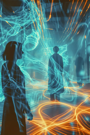 A group of individuals engaged in virtual reality amidst a colorful, illuminated environment