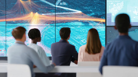 A diverse team of analysts observing a large wallmounted screen in an airport operations center where AI algorithms are visibly analyzing passenger flow and identifying suious actions