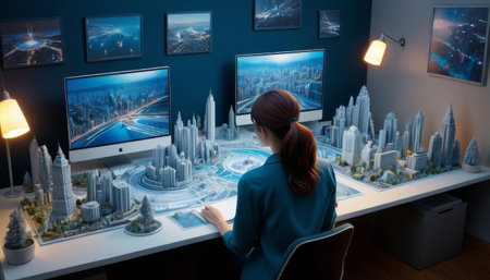 A woman in a blue shirt is engrossed in designing a futuristic city using dual monitors. The workspace is filled with miniature skyscrapers, emphasizing an urban planning theme.. AI Generation