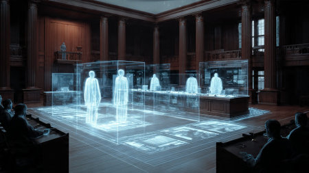 Futuristic courtroom with glowing transparent human figures and grid interface on floor