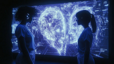 Silhouettes of two people facing each other, illuminated by colorful digital light patterns