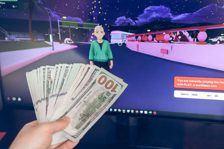 Russia Moscow 25.12.2021 Logo of Train of the Century. Blockchain nft ethereum cryptocurrency strategy game. Man playing in laptop,mobile phone. Crypto coin, token. Earning digital money.Play-to-earn.