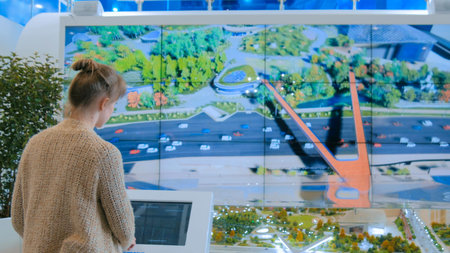 MOSCOW, RUSSIA - July 30, 2018: Moscow Urban Forum. Woman using interactive touchscreen stand and watching video presentation on large display at urban exhibition. Education and technology concept