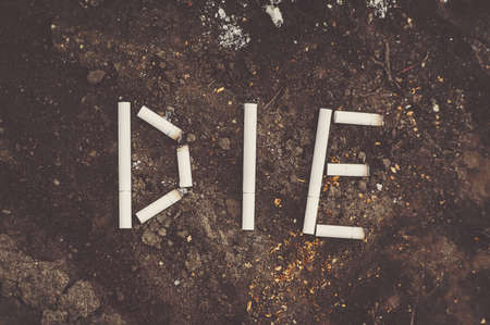 words DIE made with broken cigarettes and tobacco. no smoking sign
