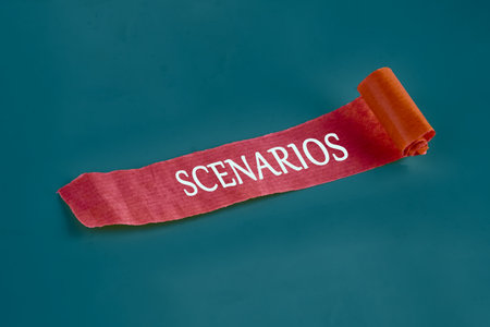 wooden cubes with red letters on blue paper, solution concept with copy space