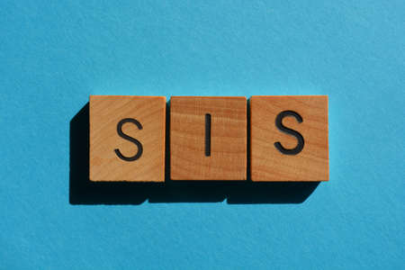 Sis, word in wooden alphabet letters isolated on blue background. A shortened version of Sister, an affectionate greeting for a close friend used by Generation Zs
