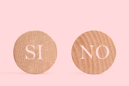 Yes and no word on a round piece of wood on a pink background (yes / no)