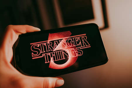 Hands holding the iPhone with shot of Stranger Things Season 3.