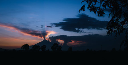 Stunning image of Popocatepetl Volcano in Mexico with an ash and vapor column at sunset, framed by silhouettes of trees and branches.