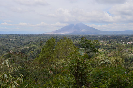Farmland and active Sinabung volcano. Agricultural landscape in Sumatra. Berastagi, Indonesia.