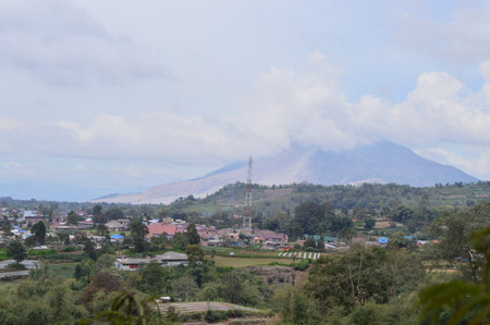 Aerial view of mount Sinabung is an active volcano on the island of Sumatra, Indonesia.