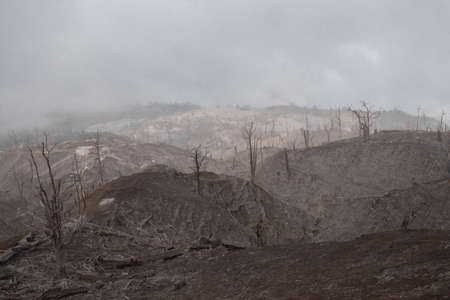 dirt road through dead forest with trees burned and dried by acid rains in the vicinity of the Turrialba volcano on a cloudy day, Cartago, Costa Rica.