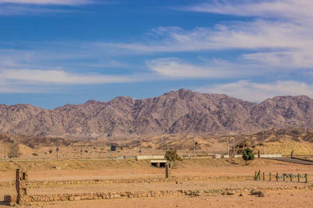 dry desert country side environment hot summer day time sand valley highway road and lanterns landscaping infrastructure objects in Israeli Middle East region, blue sky background space
