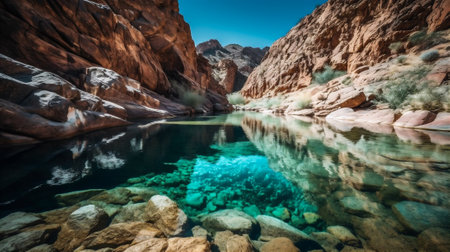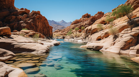 Rocky canyon filled with small pools of crystal clear water, surrounded by lush vegetation and vibrant wildlife. AI generated.