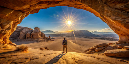 Hike to the desert at sunrise. AI generated